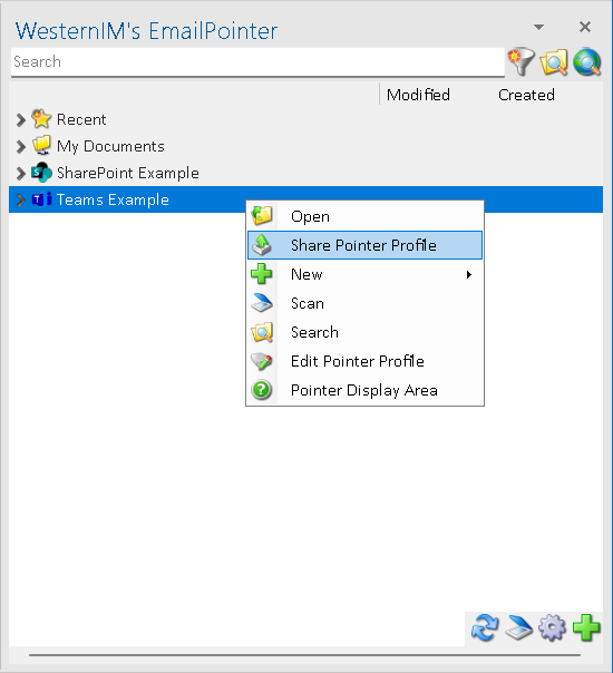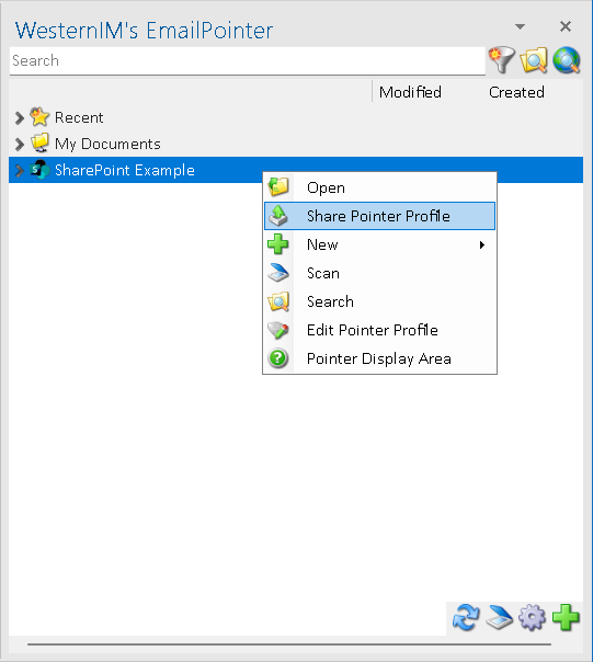 Additional Pointer Profiles may be shared in the same email by navigating back to the main EmailPointer window in Outlook and right-clicking and selecting “Share Pointer Profile” on an additional Pointer.