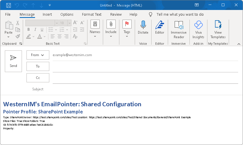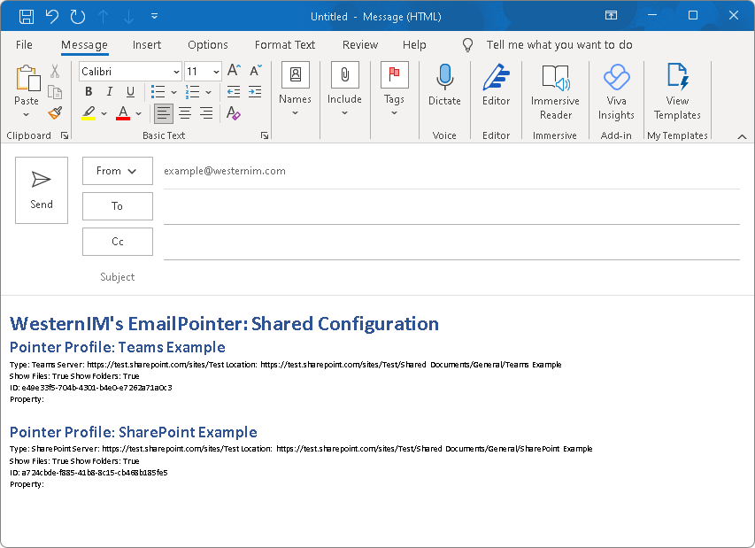 This will open a new email window in Outlook, with only the Sender email address (“From”), and the Shared Configuration information in the body of the email.