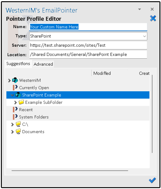 6. The Name of the Pointer Profile can be edited after the Location is selected, the default name will be the original name of the Location in the Source (the default seen above, Example Subfolder”, the example changed name is “Your Custom Name Here” in the below image).