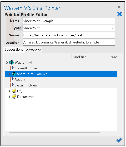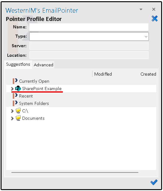 If the SharePoint site is not in the Currently Open section, and/or doesn’t appear at all in the Suggestions Tab, exit out of the Profile Editor using the blue X button () at the top right of the Profile Editor Screen. After the Main Screen has re-loaded, go to your browser and ensure that the Tab or Window that has the SharePoint Site loaded is selected or focused. Return to Outlook/EmailPointer and click the Refresh Button () at the bottom right of the Main Screen to refresh the Location Discovery for the Profile Editor, then re-open the profile editor () and check if the SharePoint Site appears within the Currently Open area of the Suggestions Tab.